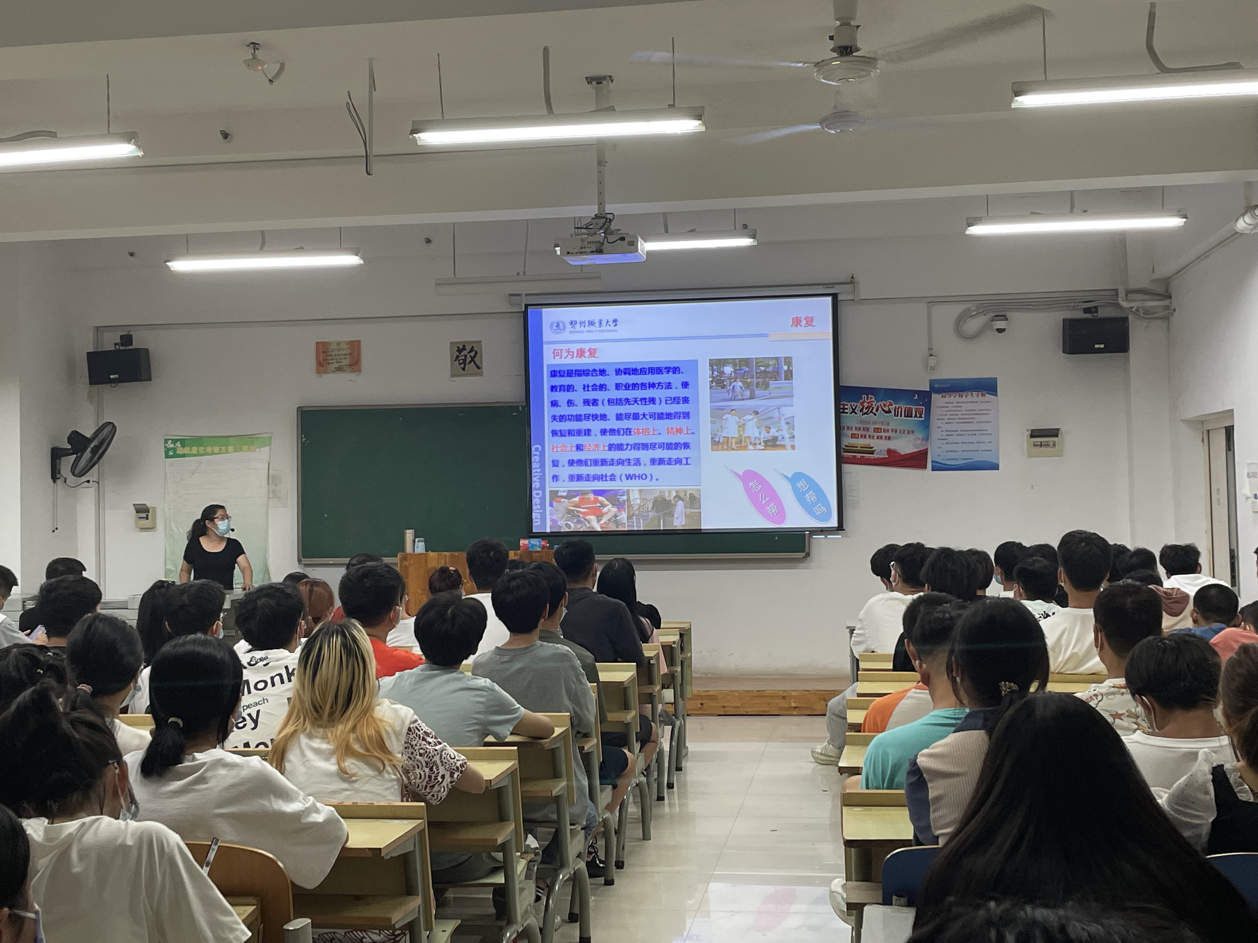 黄老师从最新中国居民健康大数据入手,谈到中国健康大战略,强调康复治疗在此战略中的重要作用,以激发学生的社会责任感,由此拉开本次新生教育的帷幕。黄老师从康复、康复治疗技术、康复治疗师、我校康复治疗技术专业四个方面给新生进行专业教育。重点介绍的内容包括:什么是康复?康复治疗技术有哪些?康复治疗师的工作内容与资格证考试;本校康复治疗技术专业人才培养目标、职业岗位及主要工作、毕业规格、课程体系、专业办学条件、专业优势、未来发展等。