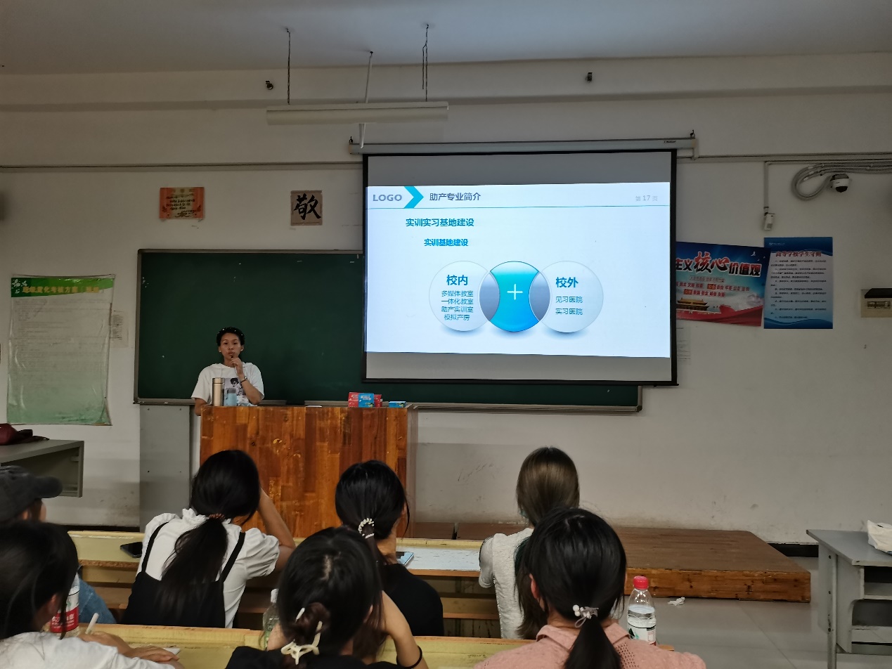 随后骨干教师董文老师从学校简介、助产专业简介、学习过程安排、大学生活规划四个方面给新生进行专业教育。详细介绍了什么是助产、什么是助产士、专业人才培养目标、职业岗位及主要工作、市场人才需求、专业办学条件、课程体系、专业学习安排、合理规划大学生活等。