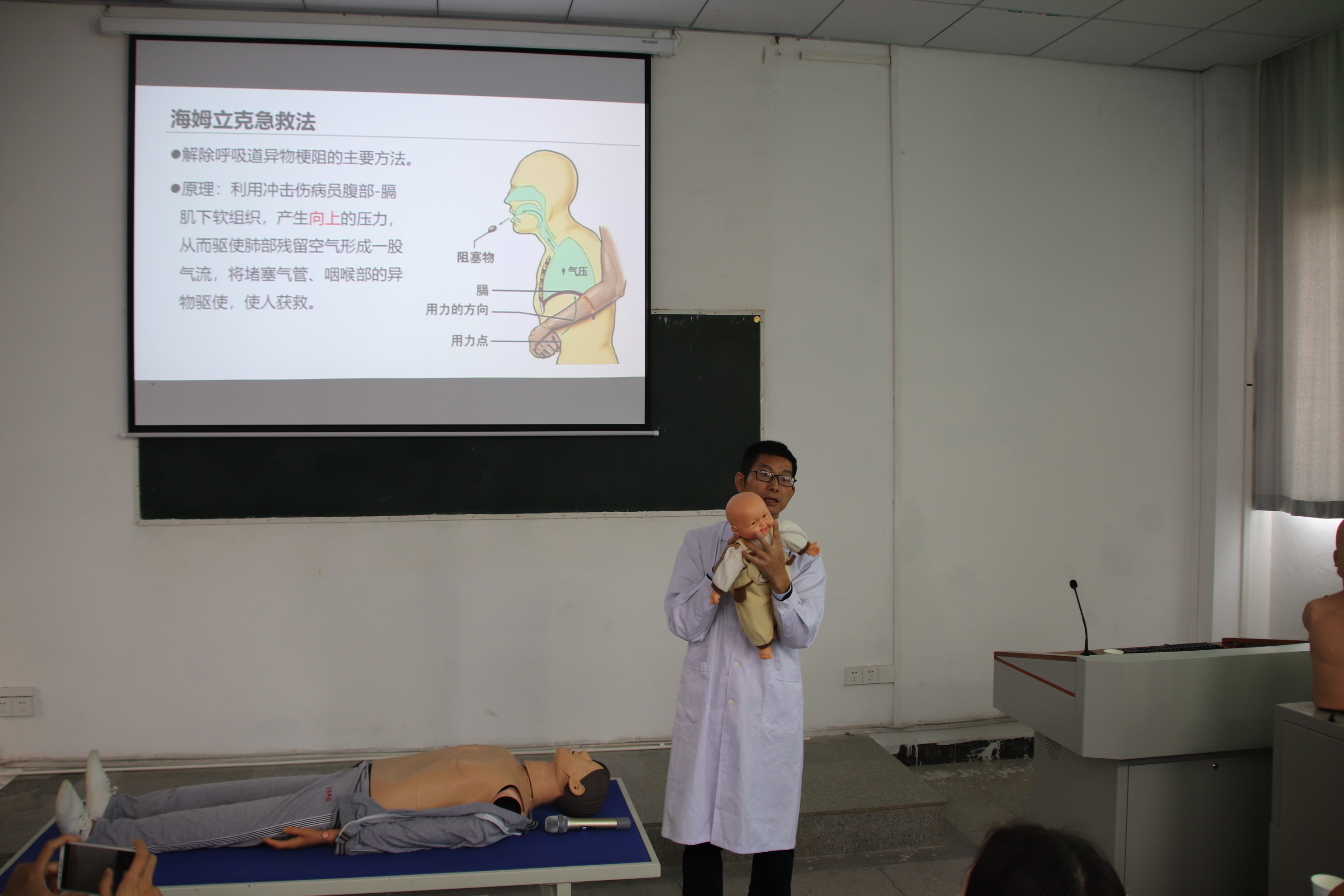培训现场,授课经验丰富的谢义群老师先从一段火车上抢救异物卡喉婴儿的视频引入了今天的培训内容——如何在黄金抢救时间内,对病人展开有效的急救。视频中,来自鄂州职业大学医学院的18级学生谌丽通过所学的海姆立克急救法成功挽救了一名6月龄婴儿的生命,在场的所有学员为鄂州职业大学培养的优秀学生点赞的同时,也深刻感受到了学习急救知识的重要性。