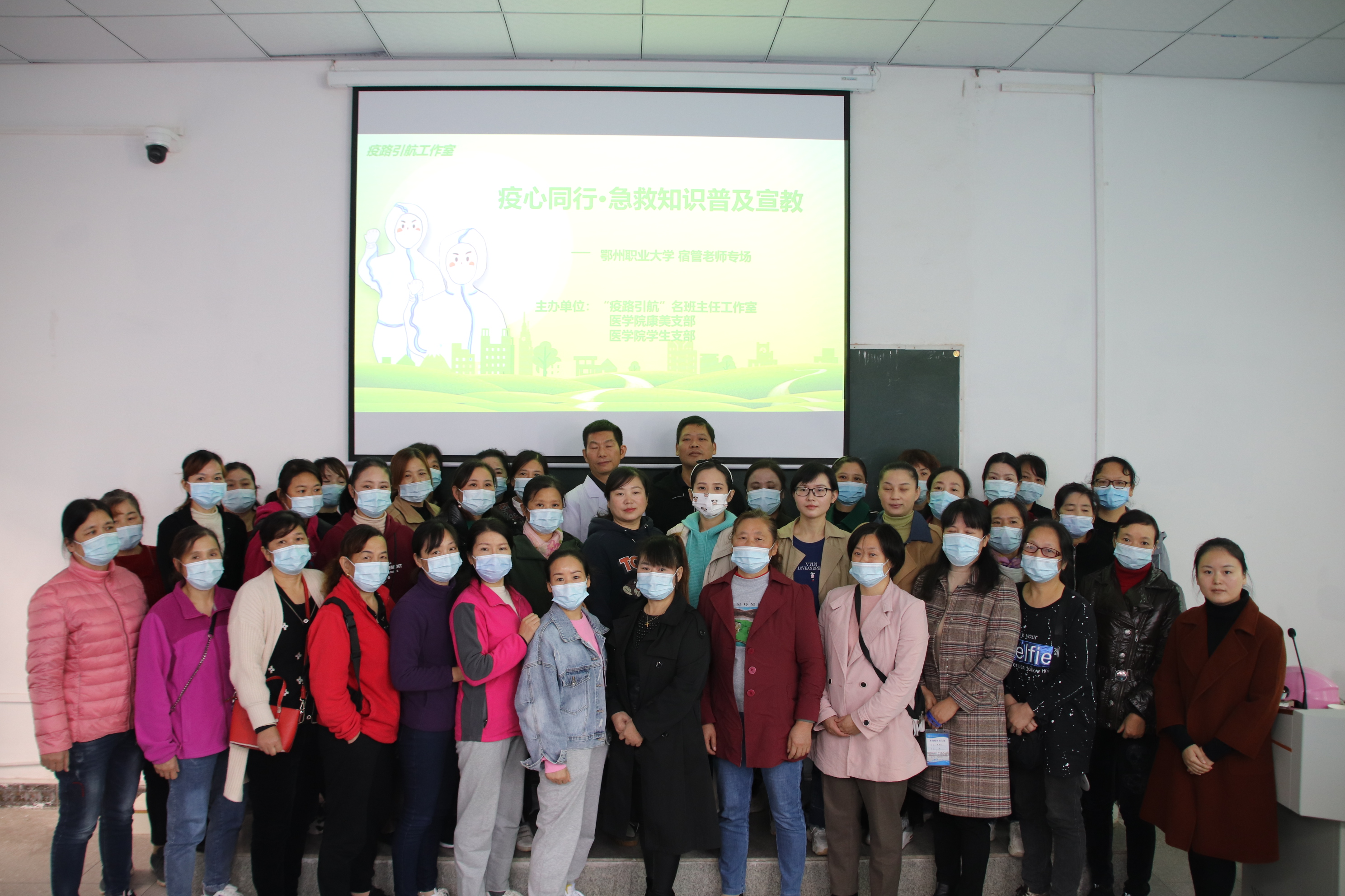 为进一步提高宿舍管理人员面对突发事件和意外伤害事故的应急避险和救护能力,大力推进平安校园、和谐校园建设,10月25日上午,鄂州职业大学“疫路引航”名班主任工作室携手医学院康美支部、学生支部,共同举办了一场急救知识普及宣教。此次培训邀请了医学院副教授谢义群进行授课,医学院院长汪艳霞、“疫路引航”工作室全体成员、康美支部、学生支部部分党员教师、鄂州职业大学后勤集团宿管中心主任王洪君及学生公寓近40名宿管阿姨参加了此次培训。