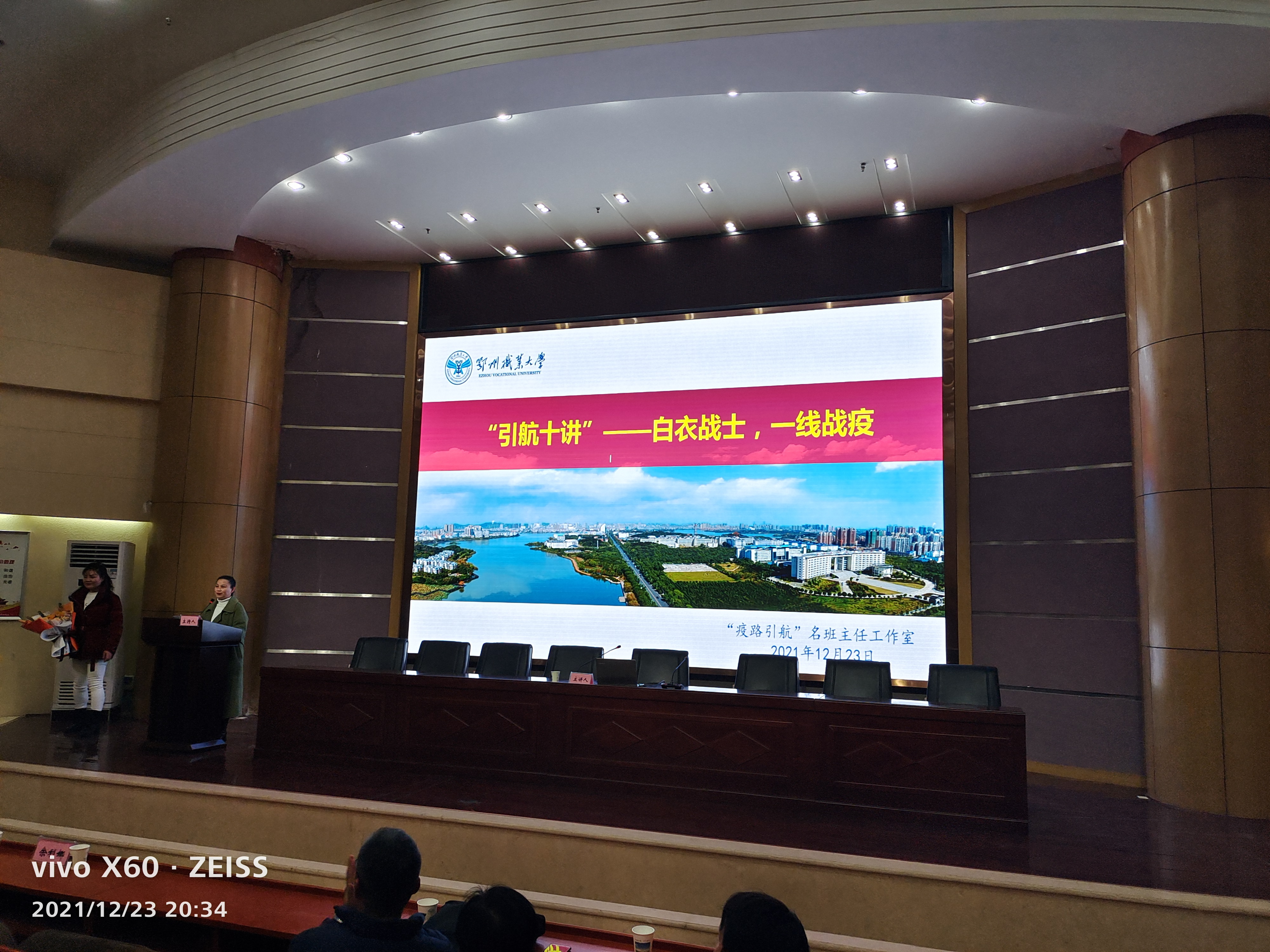 2021年12月23日晚上7点,鄂州职业大学“疫路引航”名班主任工作室精品育人项目——“引航十讲”第二讲在五号教学楼学术报告厅开讲。本次讲座邀请了鄂州市中心医院重症医学科副主任叶辉和鄂州市中心医院护理部主任余利娜主讲,工作室全体成员、医学院全体党员教师、医学院护理教研室教师、医学院青年骨干教师以及护理专业120余名学生代表参加讲座。