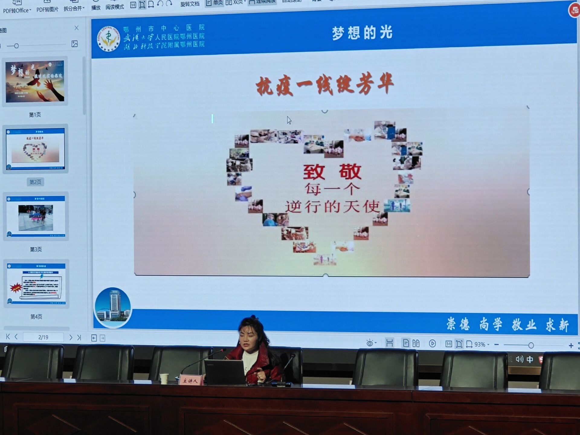 叶辉主任从“最美抗疫家庭”的角度,带着全体学员回顾了疫情来临,他和妻子从最初的彷徨无助到迅速组建临时抗疫团队,从人员、仪器、设备不足到精心治疗、精心护理,从日夜坚守到春暖花开、夺取疫情初步胜利,一幕幕感人至深的画面生动再现了抗“疫”家庭无惧生死、无私奉献的最美瞬间。余利娜主任以一段鄂州市中心医院自制的“抗疫”宣传片作为切入点,站在护理部主任的角度,从梦想和现实的反差,讲到“冬梅护理”品牌服务模式,再从榜样的力量衔接到护理青年人才成长之路,为青年护理人才的成长指明了正确方向和前进道路。