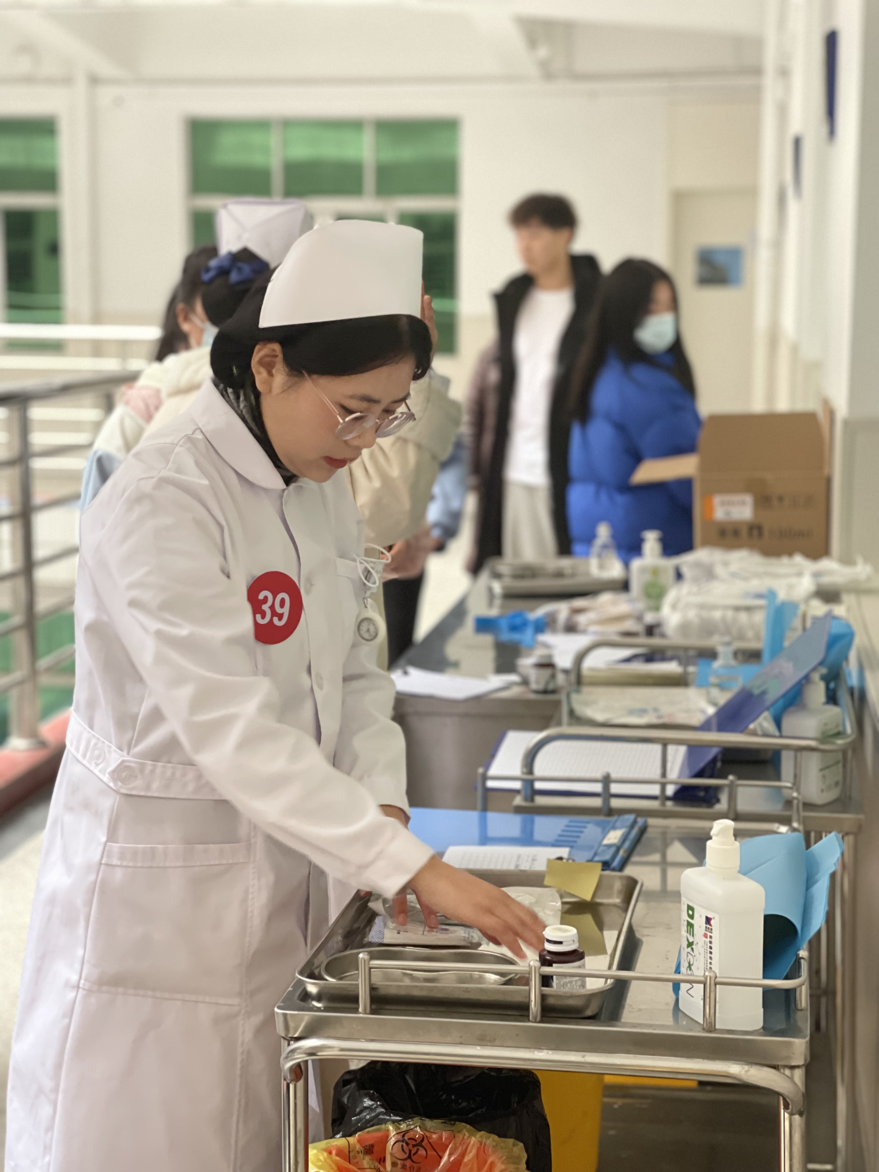 本次比赛参照省赛要求,设置了SP(标准化病人)增加比赛难度,在考察同学们的操作技能的同时,还注重“护患沟通”环节,比赛时间严格控制在8分钟之内。