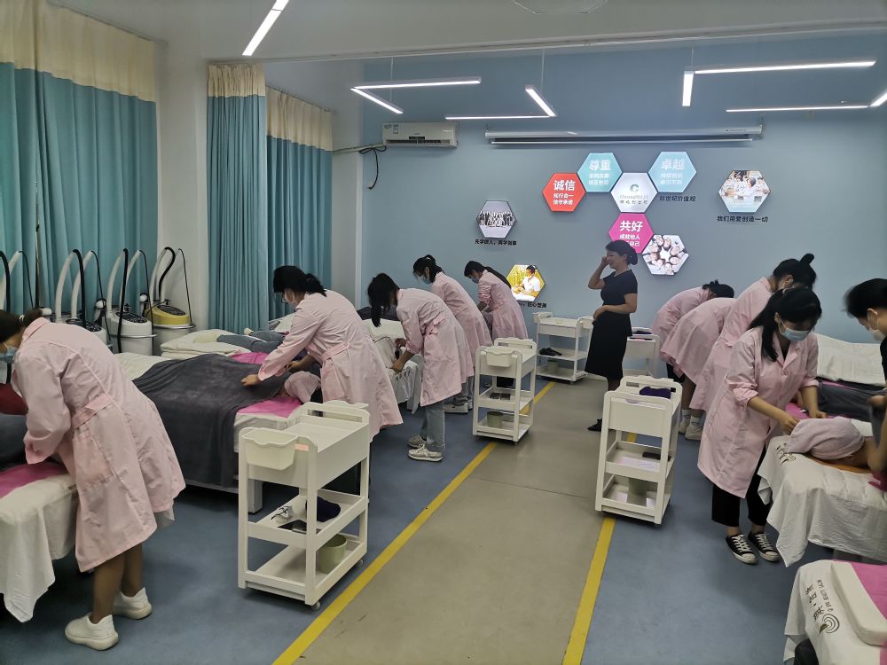 2022年5月26日,企业人力资源部陈晗部长,教育部金鹭妘总监,徐桂珍、肖银老师来我校为学员进行岗前培训第二阶段线下实操培训。本次教学分为四个环节,情感交流,手操训练,背部诊疗,肩部推按实操练习。