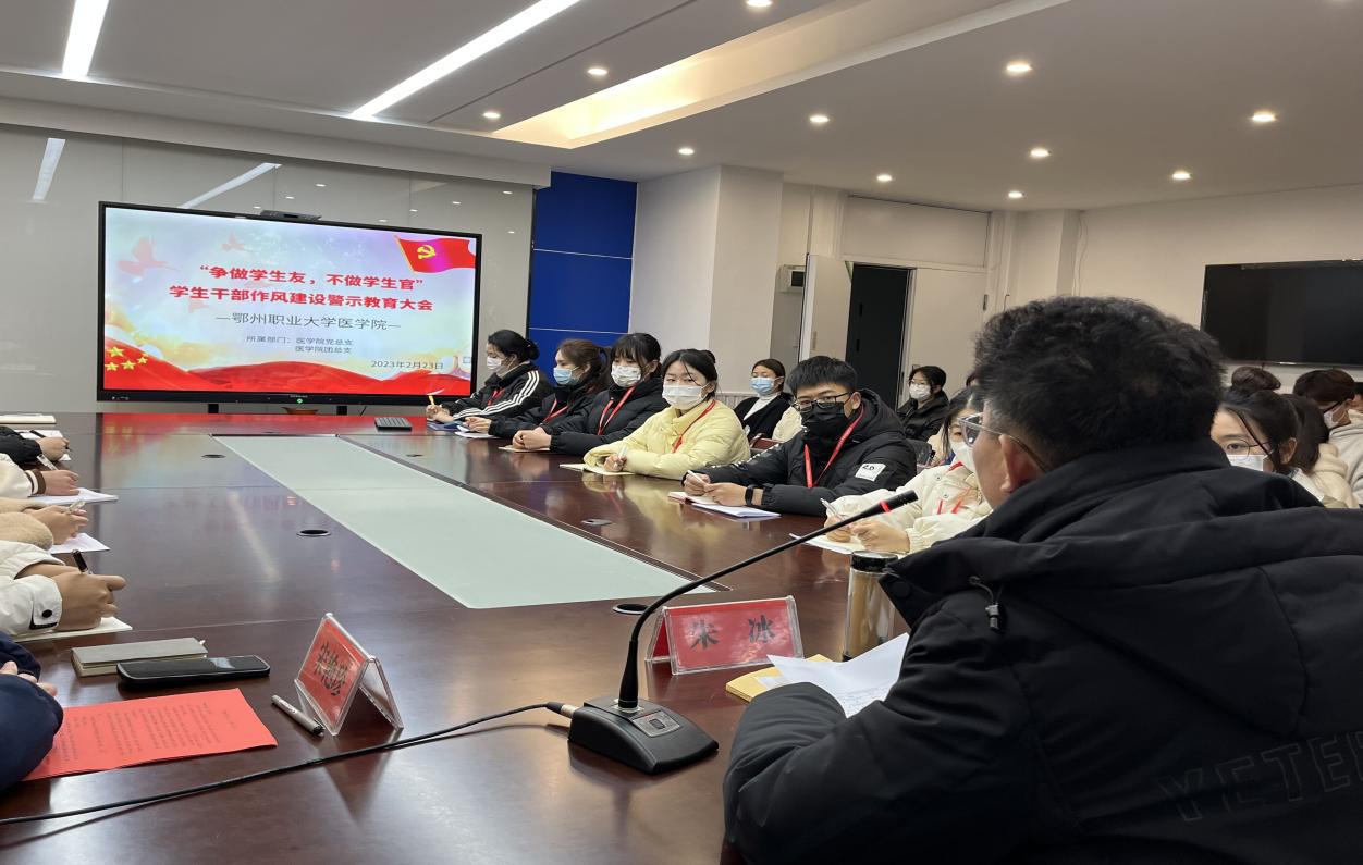 2023223日下午,在四号楼三楼会议室院召开以“争做学生友,不做学生官”为主题的学生干部作风警示教育会议。参会人员有医学院团总支、学生会、党员义工团等各部门主要学生干部代表45。医学院党总书记朱冰到会做了专题讲话