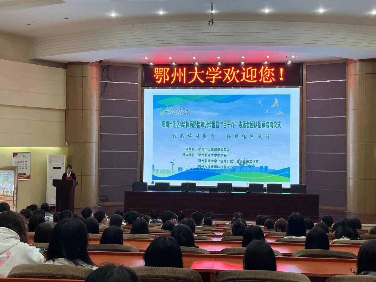 2023年3月23日下午,为了进一步宣传普及结核病防治知识,动员全社会行动起来预防和控制结核病,鄂州市健康委员会在鄂州职业大学图书馆二楼学术报告厅举办了活动主题为“你我共同努力,终结结核流行”知识宣传活动,医学院200多名志愿者和“疫”路引航名师工作室的指导老师、学校有关部门和院领导也到场参加。活动结束后,鄂州电视台现场采访了志愿者并报道了这次活动。