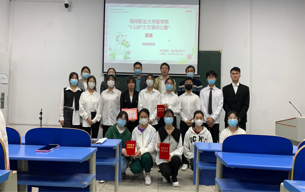 2023年5月11日晚,为纪念“5.12”国际护士节,提升医学院优质护理服务内涵,落实基础护理,为人民群众提供安全、优质、满意的护理服务,继承和发扬南丁格尔精神,鄂州职业大学医学院在四号楼阶梯二教室举办演讲比赛。