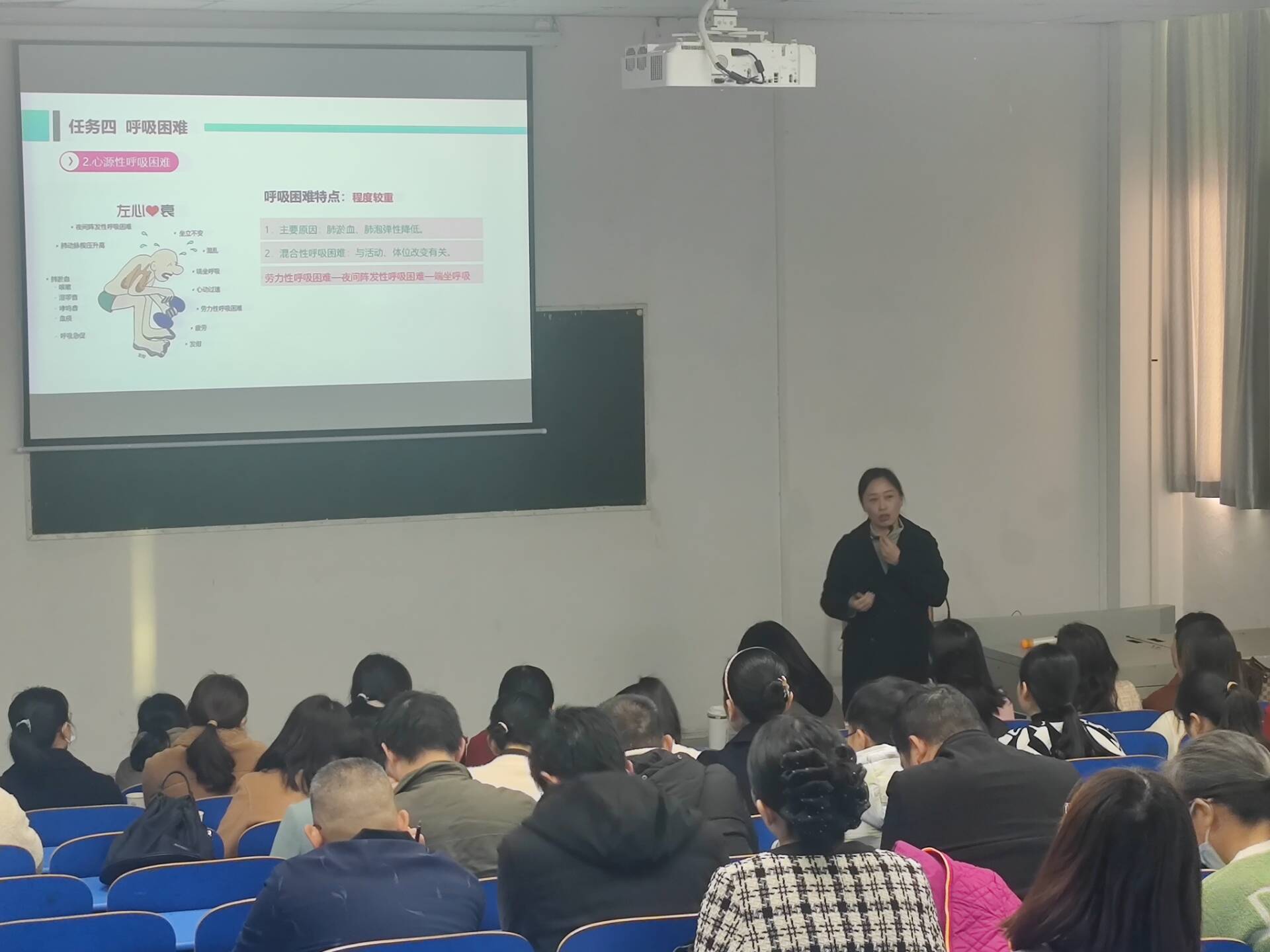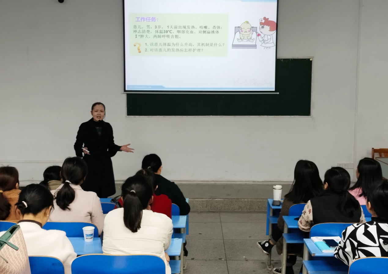 本次活动由医学院教学副院长柳淑芳主持。活动中,分别由助产教研室主任、教学名师曾丽娟老师以《异常人体结构》课程中项目“发热”为例;护理教研室资深教师陈璇老师以《健康评估》课程中项目“常见病症评估-呼吸困难”为例,为全体与坐人员带来了二节课堂讲课型授课分享。
