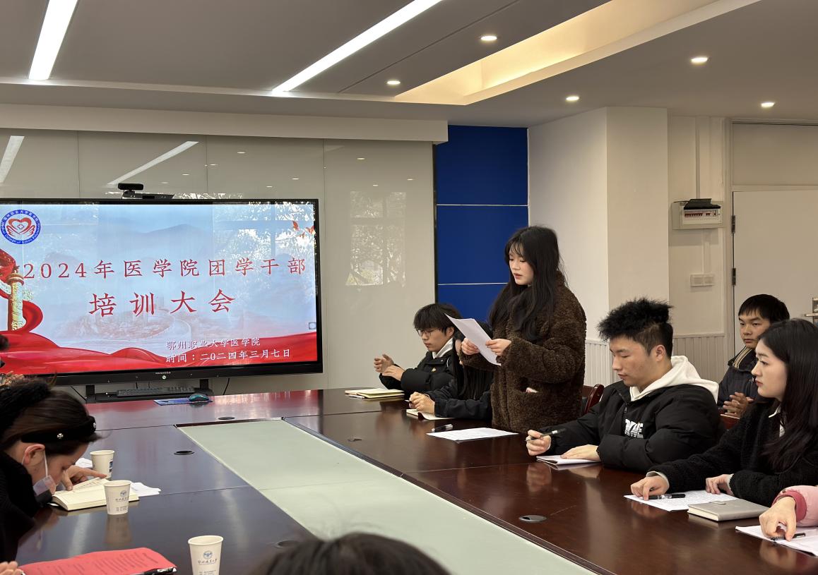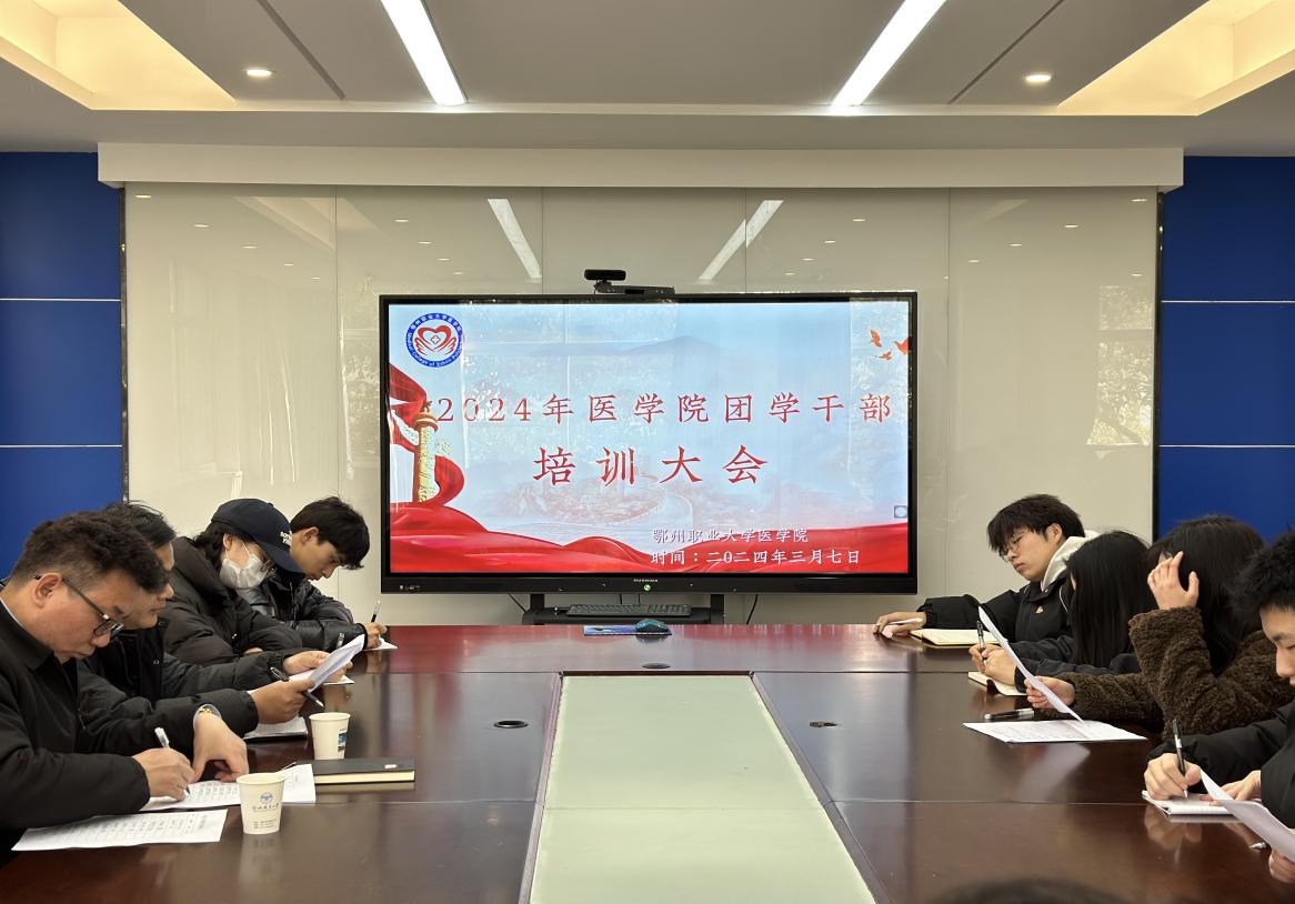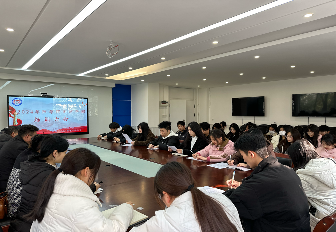 202437日下午,在四号楼三楼会议室开展了“满弦待发,力谋新篇”主题的团学干部培训会活动。该活动旨在加强我院学生干部队伍的建设,提高学生干部的综合素质和责任意识,明确新学期各部门的工作任务、工作职责、工作要求,计划好对未来部门工作的规划。医学院党总支书记朱冰、医学院党总支副书记徐小军到会并讲话,会议由医学院团总支书记汪希主持。医学院22级全体团学干部到会参训。