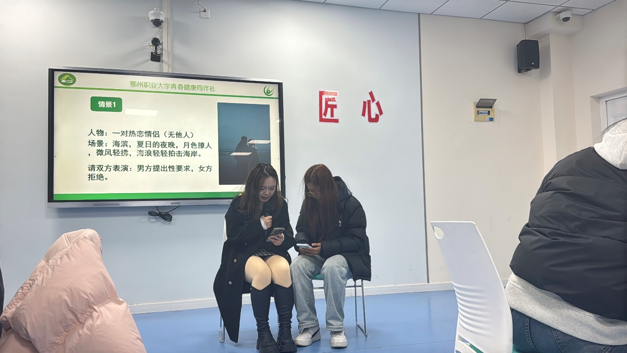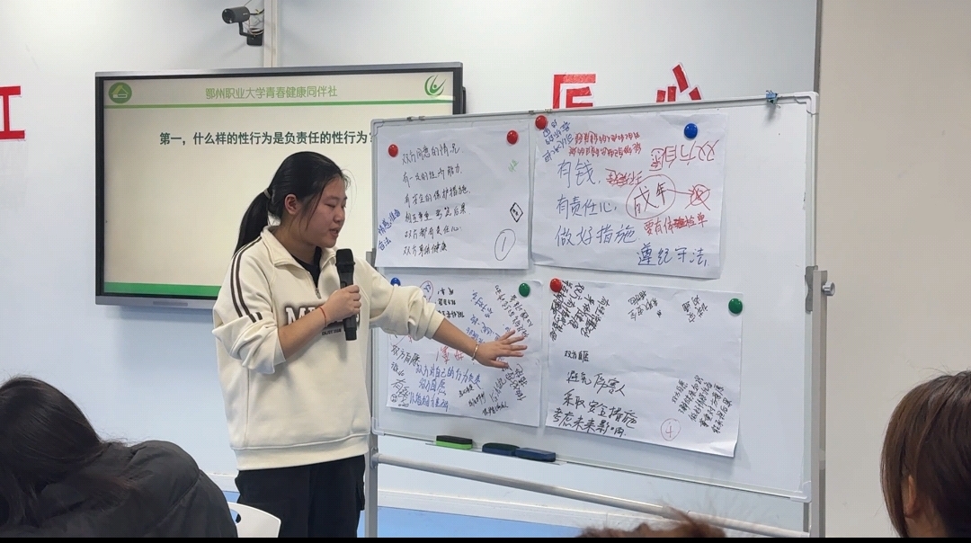 2024年12月3日晚,在鄂州职业大学五号楼W区702智慧教室,我校青春健康同伴社开展了以“性行为与做决定”为主题的同伴教育活动,此次活动由我校青春健康高校项目组胡馨方老师指导,青春健康同伴社的姬欣洁同学主持。
