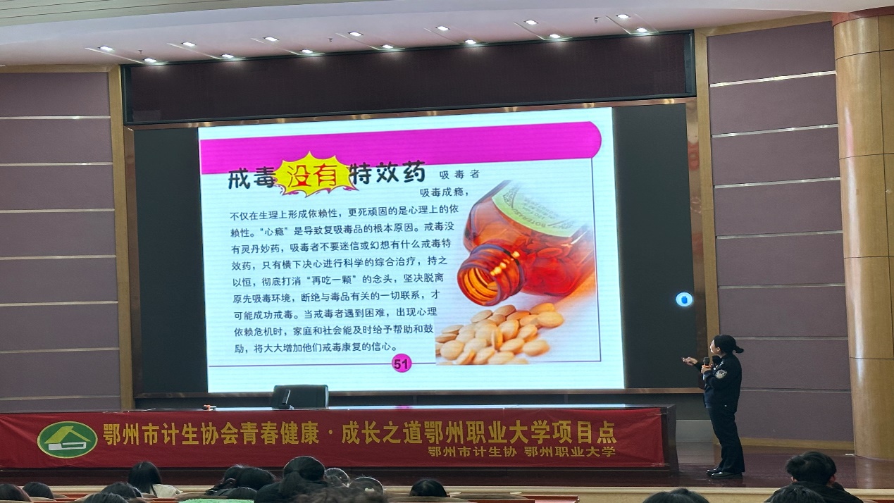 2025年2月17日晚7点,鄂州职业大学青春健康高校项目组于五号楼学术报告厅,面向全校青年大学生,举办了主题为“健康人生,绿色无毒”的讲座活动,此次讲座很荣幸邀请到了鄂州市公安局禁毒支队的专家占蕊聪警长为同学们进行讲解。我校青春健康项目组特别策划这次讲座,旨在提高大学生们对毒品危害的认识,增强自我保护意识,引导同学们树立健康的生活方式,远离毒品的侵害。