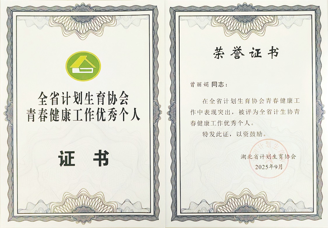 2025915日于荆州举行的湖北省计生协青春健康工作推进会上,中国计生协国际合作部部长王东风、湖北省卫健委一级巡视员、省计生协专职副会长张友芳等领导出席会议。会上,我校青春健康项目荣获三项省级荣誉:项目团队获评"优胜单位"、《青春健康高校项目》获评"优秀项目"、曾丽娟老师获评"优秀个人"。作为全省优秀项目代表,曾丽娟老师现场汇报了我校近年来在青春健康教育工作中的创新实践与成效。