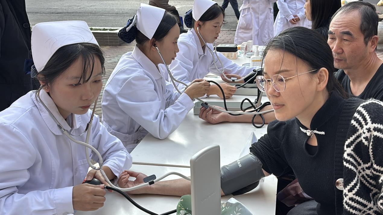 文艺活动余温未散,专业的义诊服务展开。健康义诊区,党员教师和学生志愿者分工协作,有条不紊地为老人们提供血压、血糖测量服务。志愿者们耐心细致,不仅认真记录每一位老人的检测数据,更是在党员教师的带领下,结合老年人的生活习惯,从饮食、运动、用药等方面提供个性化的健康指导和咨询服务,将专业的健康知识送到老人身边。古楼派出所的民警同志也在现场协同维持秩序,共同保障活动安全、有序进行,展现了区域党建联建的协同效能。
