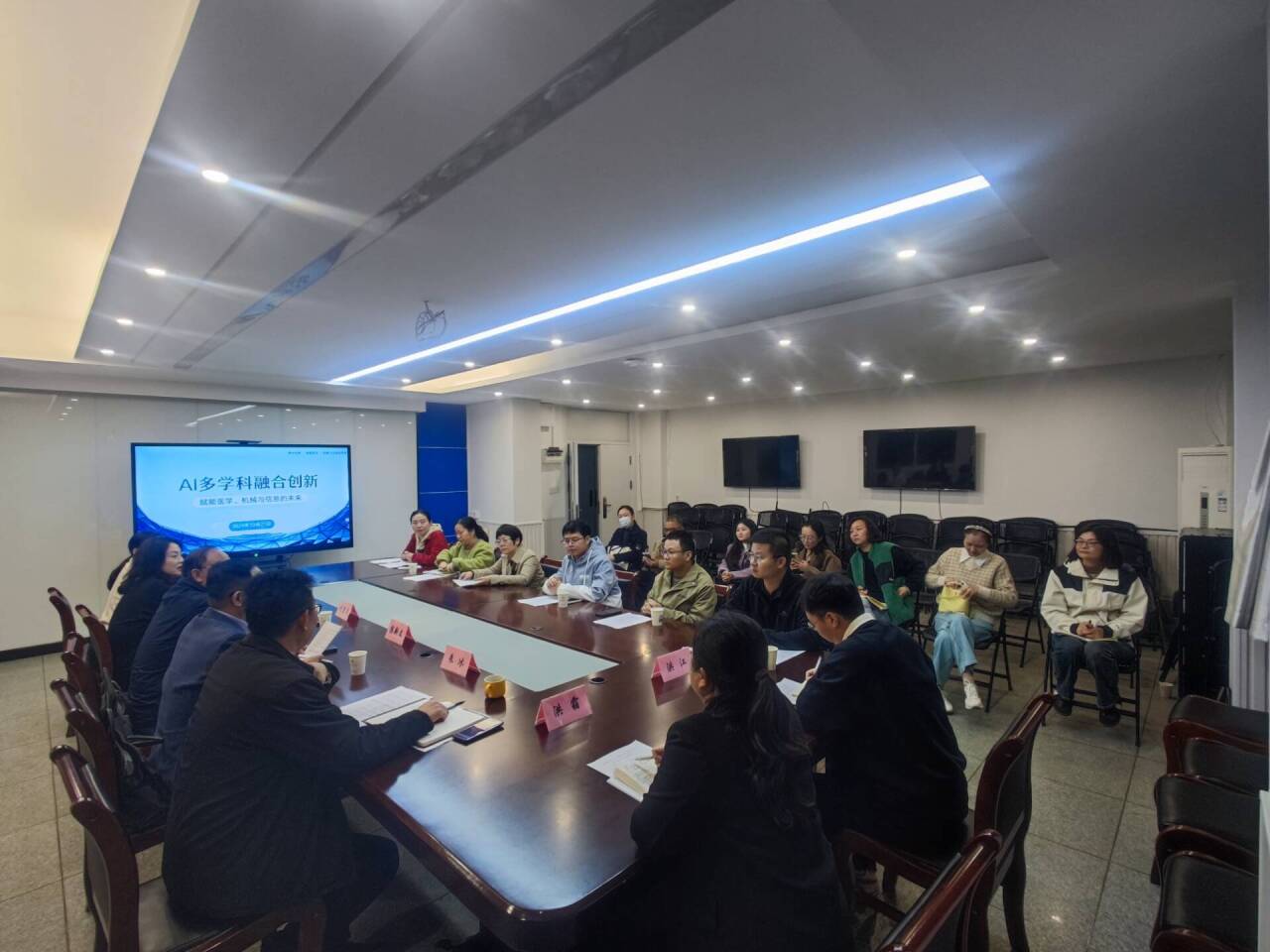 随后,在主题分享环节,三大学院“掌舵人”各展所长、精准破题。医学院院长汪艳霞结合本院资源禀赋,聚焦AI在精准护理、智能诊疗设备等领域的应用潜力,提出明确需求,让AI赋能医学发展的方向更清晰;机械工程学院院长刘宏文详解AI在高端装备、机器人、数字孪生等方向的实践场景,深入探讨AI与医学、信息学科的交叉结合点,为产学研融合提供思路;信息工程学院院长陈新文则亮出AI核心技术平台与团队实力,主动表达技术支撑意愿,为跨学科合作筑牢技术根基。三位院长的分享从不同维度勾勒出AI融合创新的应用图景,为后续研讨奠定了基础。