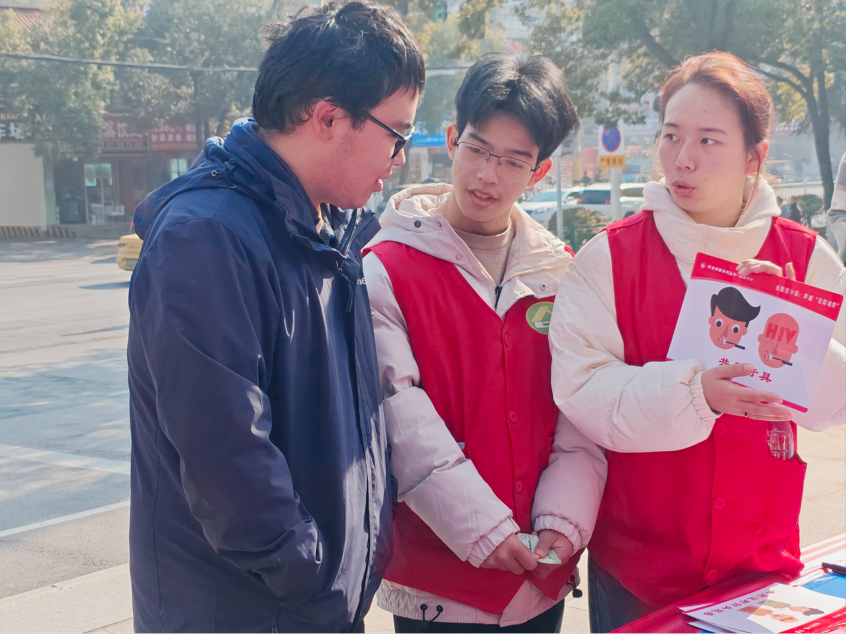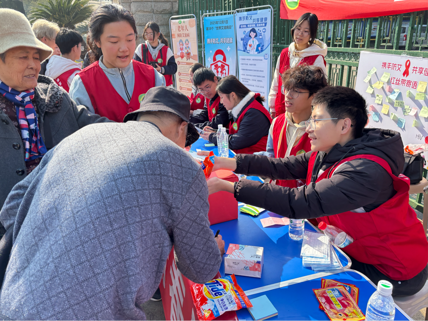 2025年12月6日上午9点,在第38个“世界艾滋病日”来临之际,我校青春健康“青铸未来”项目组于本市凤凰路西区广场成功举办“携手防艾,共享健康”主题宣传活动。作为国家级“青铸未来”高校项目的重要组成部分,本次活动旨在面向广大市民普及艾滋病防治知识,消除社会误解与歧视,以青年行动传递防艾力量,营造科学防艾、关爱包容的良好社会氛围。