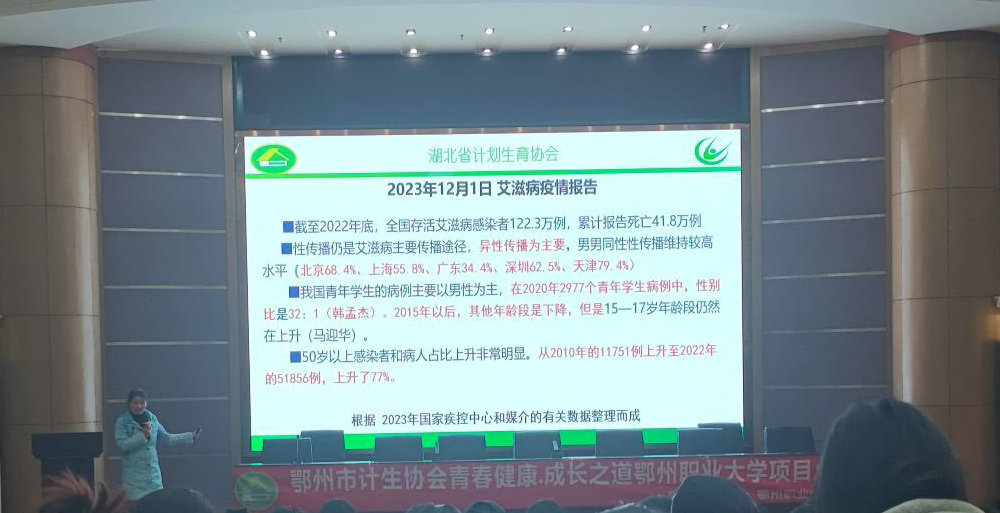 秦春莲副教授以“倡导安全性行为,预防性传播疾病”为主题,结合最新疫情数据,系统阐释了我国性传播疾病的流行现状与防控挑战。她指出,青少年是国家的未来,校园是性健康教育的重要阵地,当前艾滋病等性病传播途径复杂,性传播仍为主要途径,其中男男性行为等高危行为导致的感染占比持续上升,青年群体防控形势严峻。秦教授提醒同学们务必高度重视,主动学习健康知识,定期进行筛查,筑牢自我保护的第一道防线。