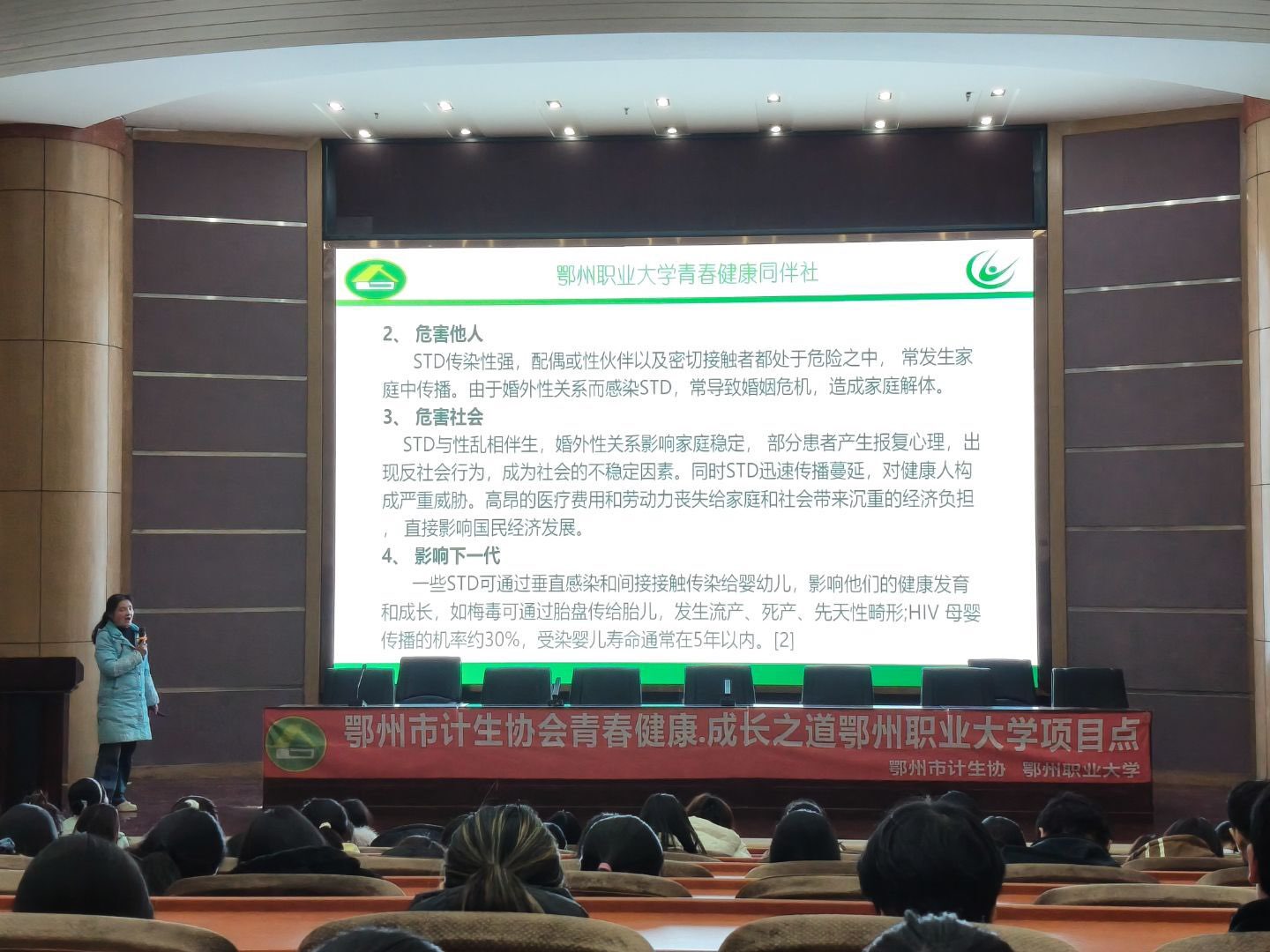 为引导青年学生树立科学性健康观念,增强性传播疾病防控意识,2025年12月9日下午,由我校青春健康“青铸未来”项目组策划的“倡导安全性行为,预防性传播疾病”主题讲座在五号楼学术报告厅成功举办。活动特邀医学教育健康促进专家秦春莲副教授主讲,青春健康同伴社社长陈翰卿主持,全校各院系200余名学生代表参加学习。