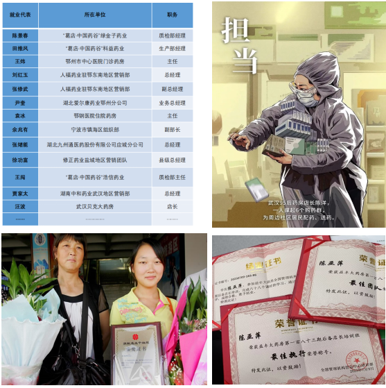 在长期的办学实践中,本专业培养了大量深受用人单位好评的毕业生,除了医药行业精英外,还有创业英才、大赛之星及时代新人。其中包括全国大学生就业创业典型人物,湖北省第六届“长江学子”——陈洋,她在抗击疫情中登上了《人民日报》推出的《20张手绘,致敬每一次义无反顾》,并有幸与钟南山院士同框。