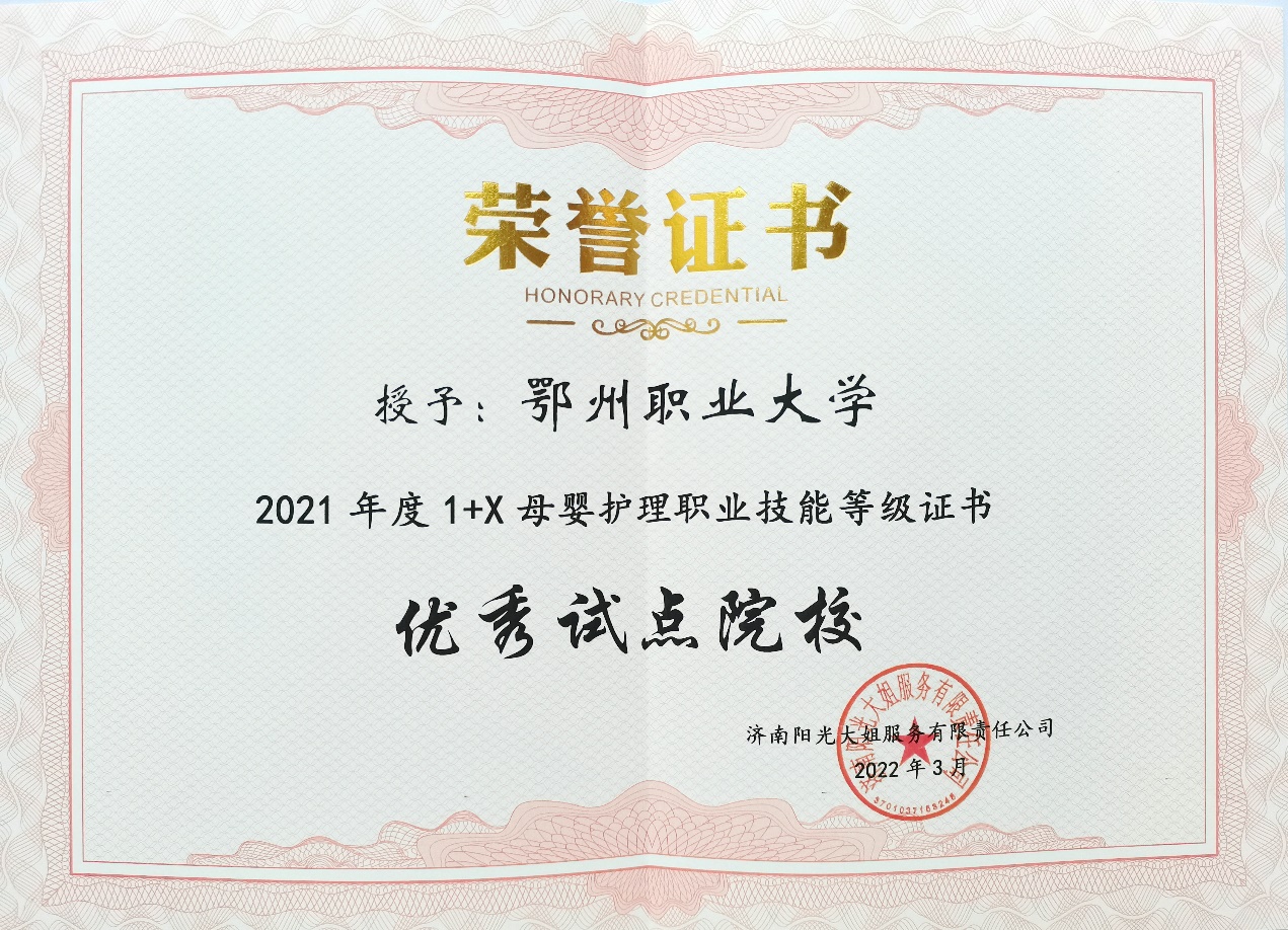 1+X母婴护理职业技能等级证书优秀试点院校证书
