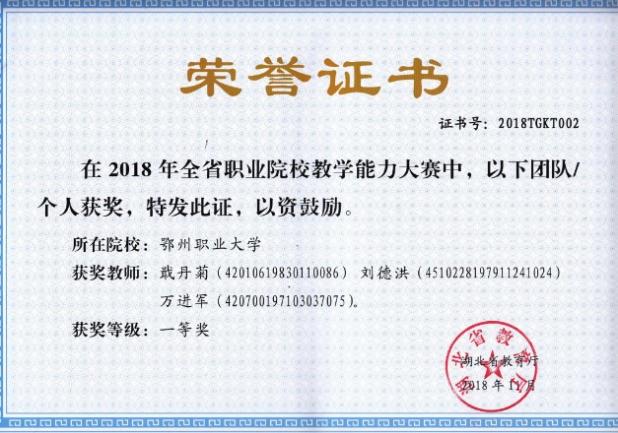 本专业拥有“双师”结构合理的教师教学团队,建设有湖北省职业技能名师工作室和校级科研创新团队。专业教师教学经验丰富,在多项教学大赛中取得了好成绩,同时指导学生参加国赛,成绩显然,教师团队教科研成果丰硕。
