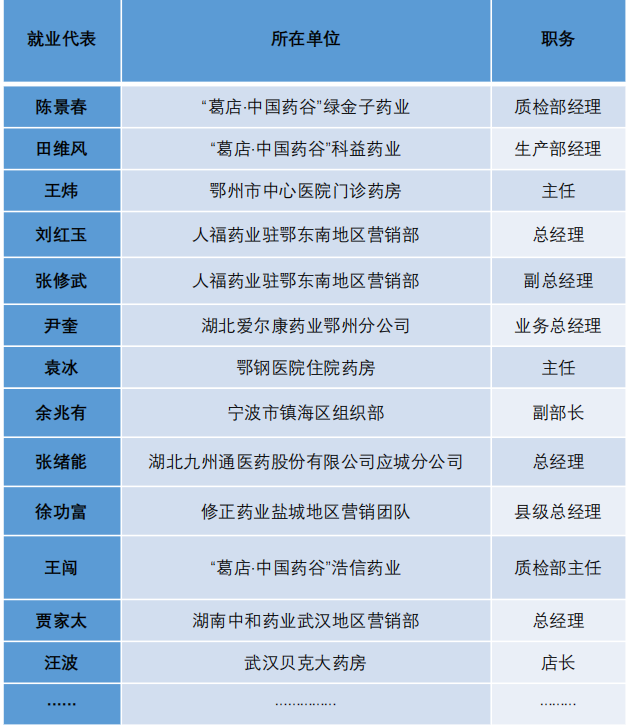 在长期的办学实践中,本专业培养了大量深受用人单位好评的毕业生,除了医药行业精英外,还有创业英才、大赛之星及时代新人。其中包括2020年全国大学生就业创业典型人物,湖北省第六届“长江学子”——陈洋,她在抗击疫情中登上了《人民日报》推出的《20张手绘,致敬每一次义无反顾》,并有幸与钟南山院士同框。