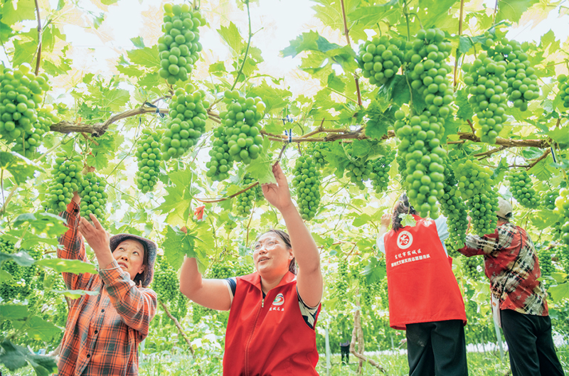 近年来,江苏省宿迁市宿城区支口街道大力实施党建引领强村富民工程,采取“党建+合作社+农户”运作模式,组织党员志愿者走进田间地头生产一线,引导群众因地制宜发展山楂、葡萄等特色产业种植,拓宽增收渠道,助力乡村振兴。图为2023年6月30日,在宿迁市宿城区支口街道探楚社区葡萄种植基地,党员志愿者和果农一起管护葡萄。 人民图片 徐江海/摄